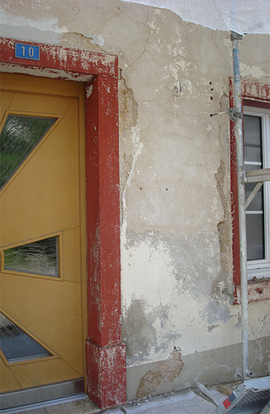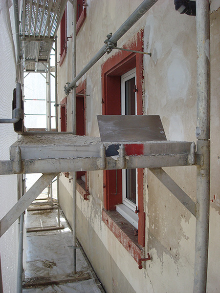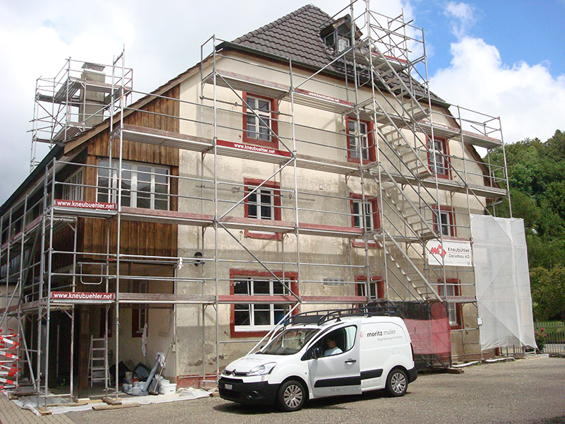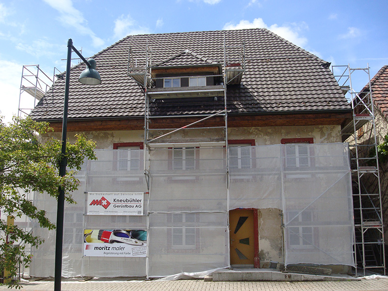 Unser Gebäude Rosengarten an der Bärenwilerstrasse 10 in Langenbruck erhält nach der umfangreichen Renovierung der Innenräume auch aussen eine Auffrischung.Nachdem die Firma Kneubühler aus Sissach das Gerüst gestellt hat, sind nun die Mitarbeiterinnen und Mitarbeiter der Firma Moritz Maler aus Augst damit beschäftigt den alten Putz herunter zu waschen. In einem nächsten Schritt wird die Fassade wo nötig neu aufgebaut. Anschliessend erhält das ganze Gebäude einen neuen Anstrich.