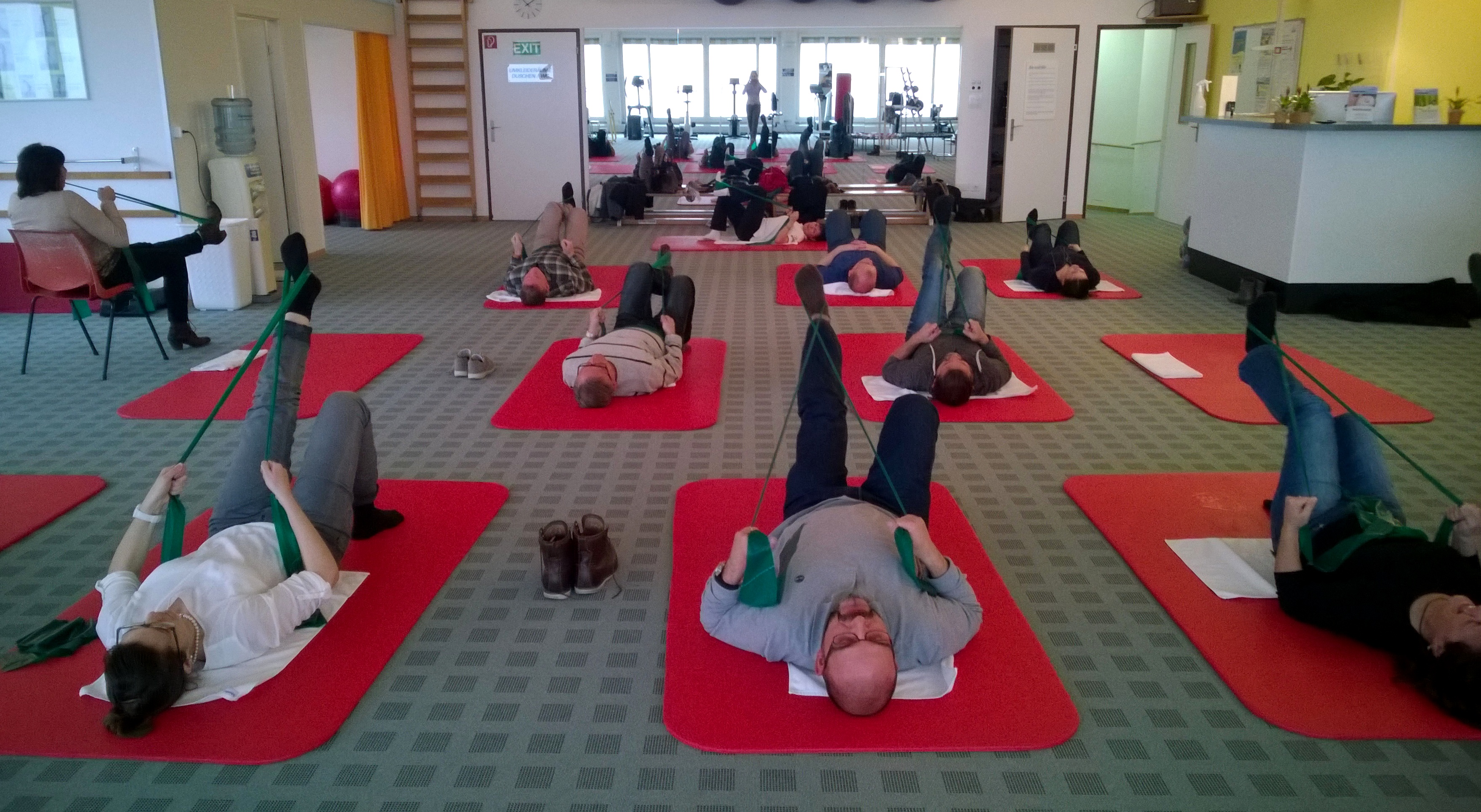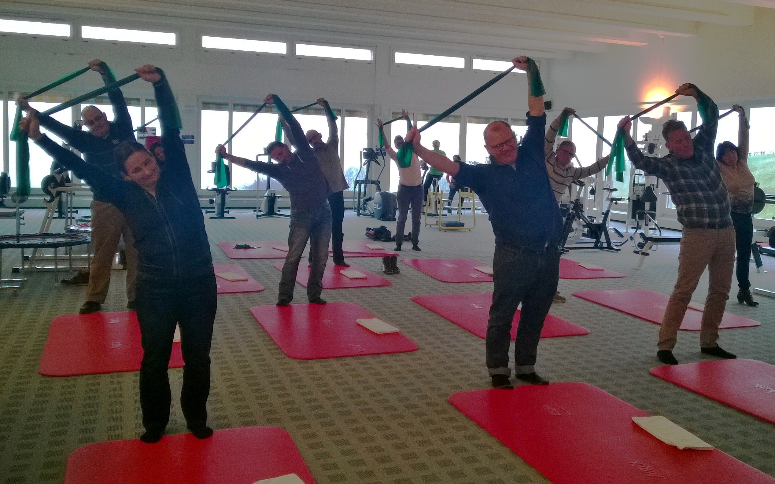 Nach der intensiven Kopfarbeit kam auch die Bewegung nicht zu kurz. Unter dem Motto "Fit am Arbeitsplatz" hat die Fitness-Instruktorin des Bad Ramsach dem Flexor-Team einfache und effiziente Übungen mit dem Thera-Fitband gezeigt. Übungen, die jederzeit am Arbeitsplatz durchgeführt werden können. Als Geschenk haben alle ein Thera-Fitband bekommen - eine kleine Aufforderung, täglich dran zu bleiben. Mit Kopf und Körper.