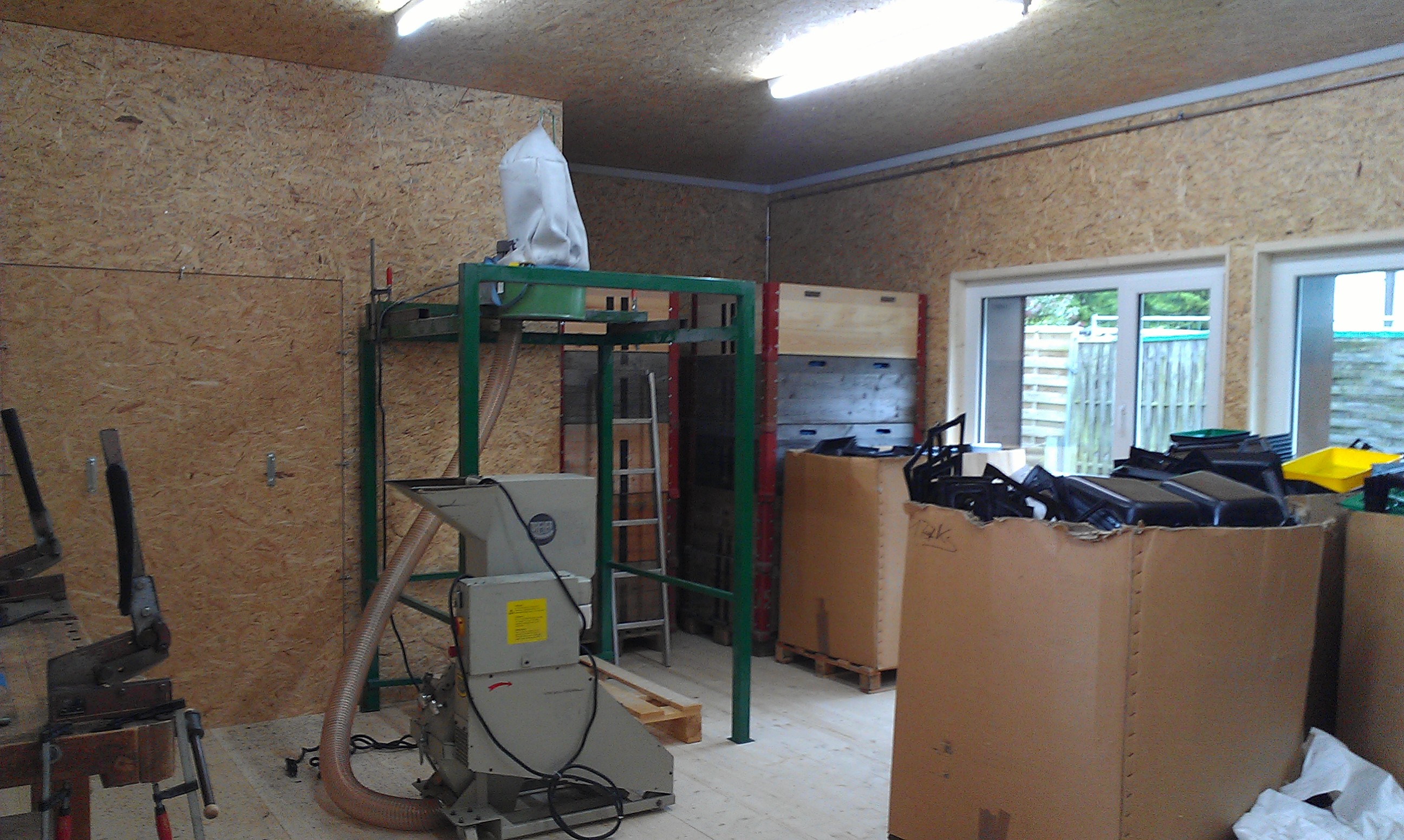 Nach einer kurzen Umbauzeit wurde der offene Unterstand hinter der Kunststoffverarbeitung in einen Raum für Kunststoffabfälle umgebaut. Am 3. Juni konnte Josef Meier, unser langjähriger Mitarbeiter im Recycling, seinen neuen Arbeitsplatz beziehen. Jetzt ist bei der Kunststoffverarbeitung von der Verarbeitung bis zum Recycling alles unter einem Dach vereint und die Wege sind kurz. Der Recycling-Raum wird mit der Abwärme aus der Produktion beheizt. Den alten Raum im Schopf an der Bärenwilerstrasse 10 wird neu von den Mitarbeitenden des Bereichs Dienste für die Unterbringung der Gerätschaften genutzt.